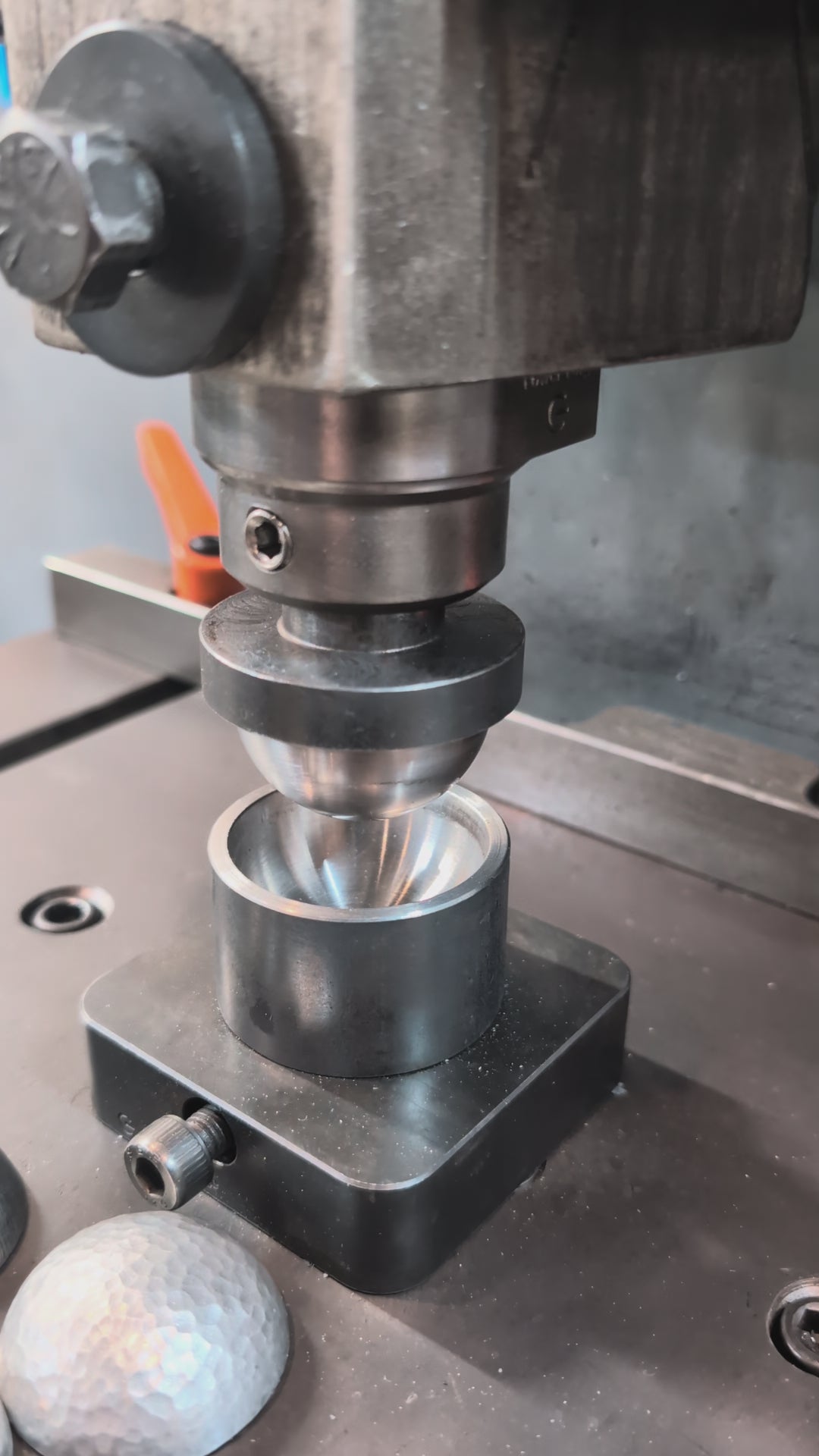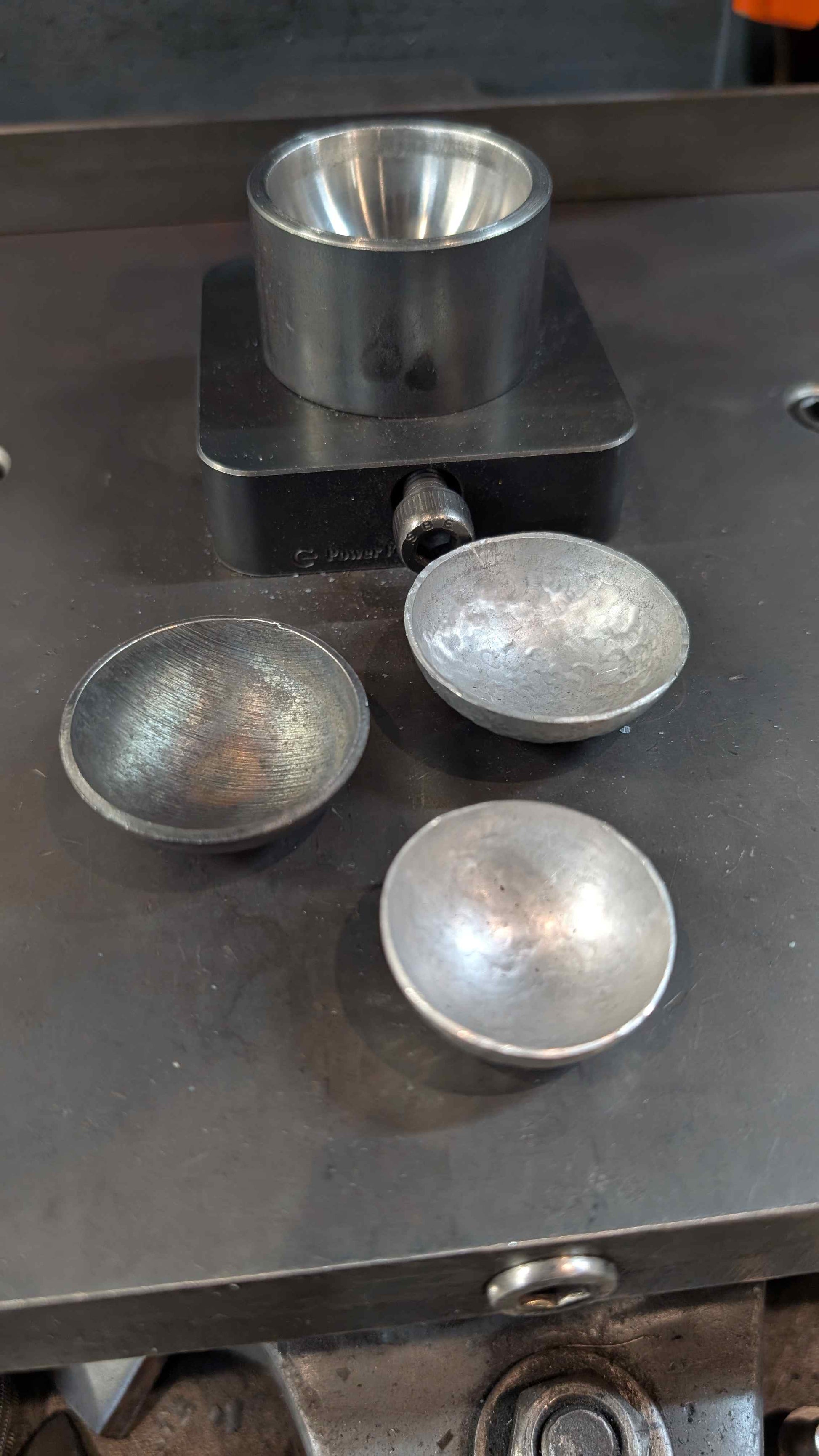 The Top Die – A matching concave counterpart that nests precisely over the bottom die. When the fly press closes, the two surfaces meet at a single point, forcing the metal into a hemispherical profile.