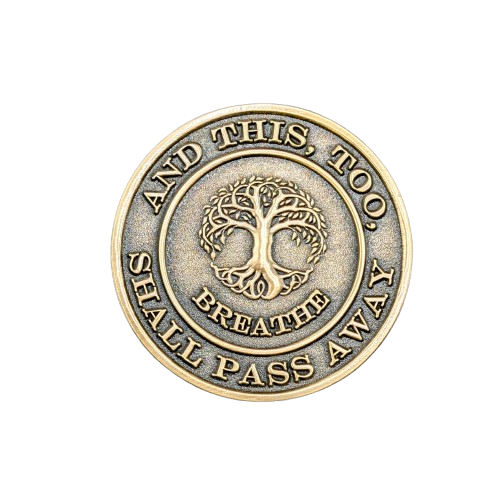 Front Design: The phrase "This Too Shall Pass Away" encircles a beautiful Tree of Life, symbolizing resilience and renewal, with the word “Breathe” as a grounding reminder to stay present.