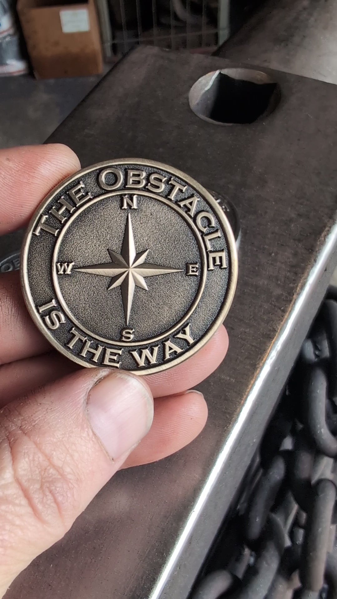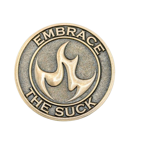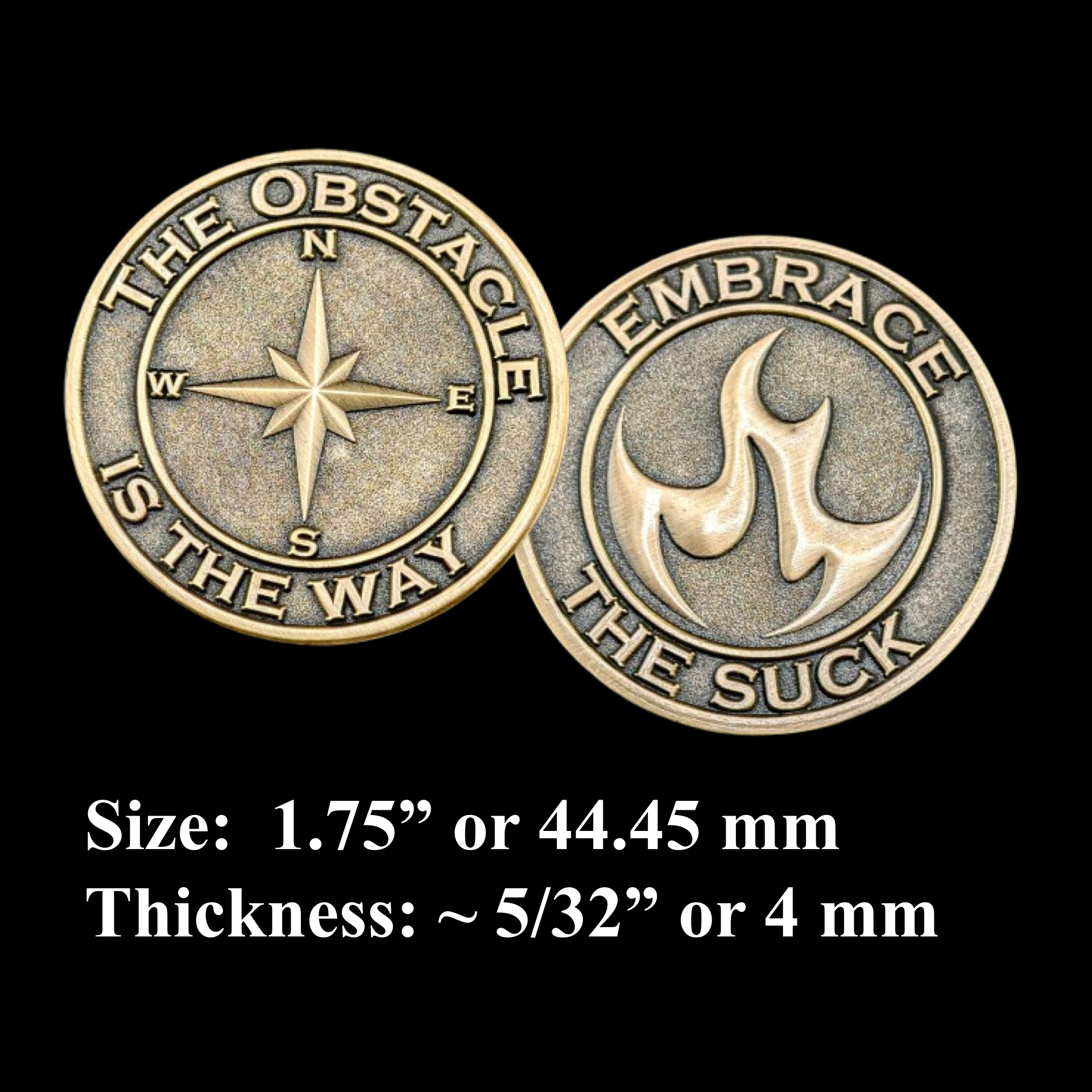 Design: Front side features the phrase "The Obstacle is the Way" encircling a compass rose—guiding you to persevere. The reverse side carries the phrase "Embrace the Suck" around a stoic flame, symbolizing inner strength.
