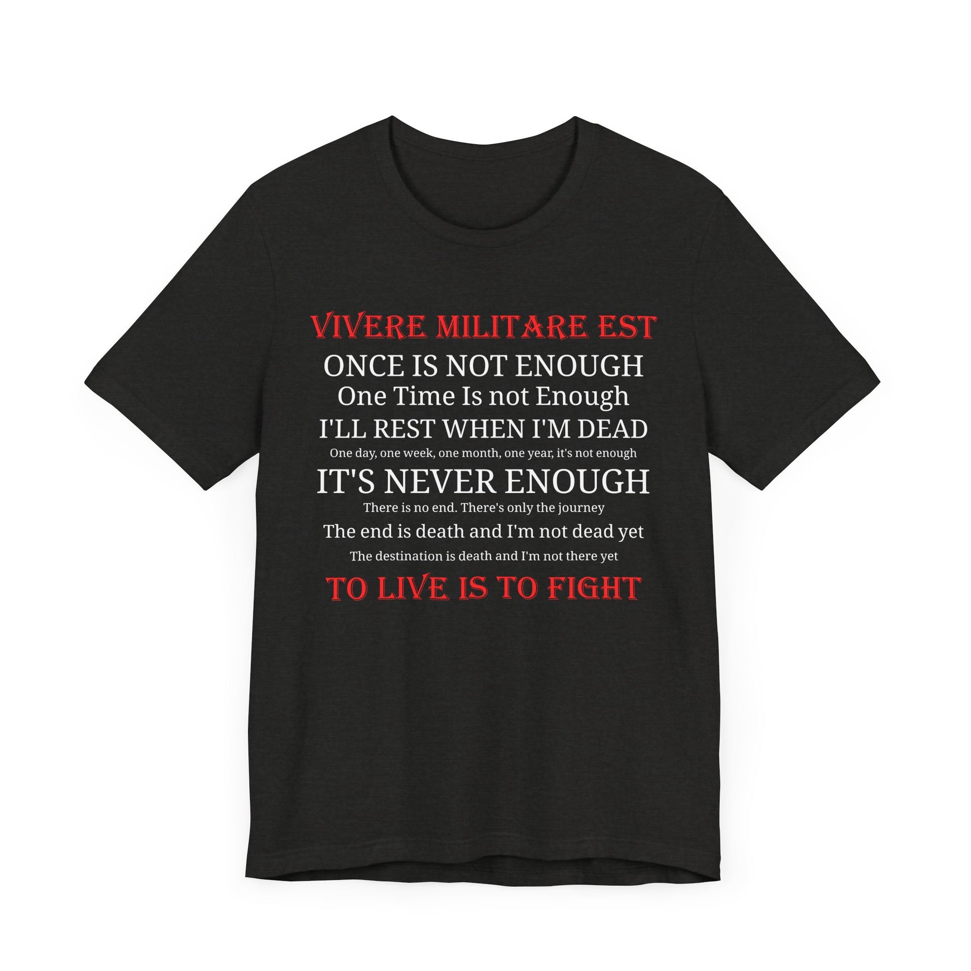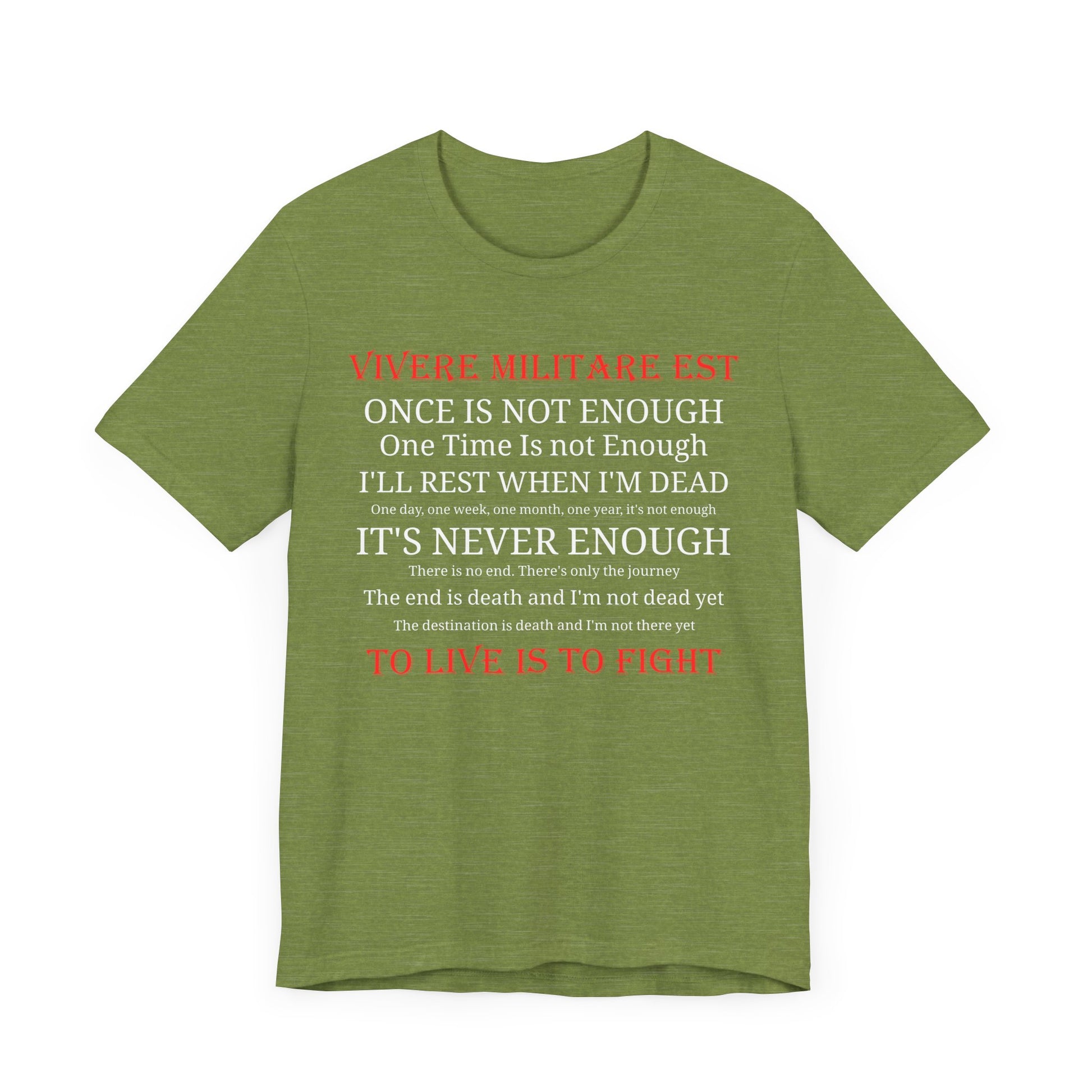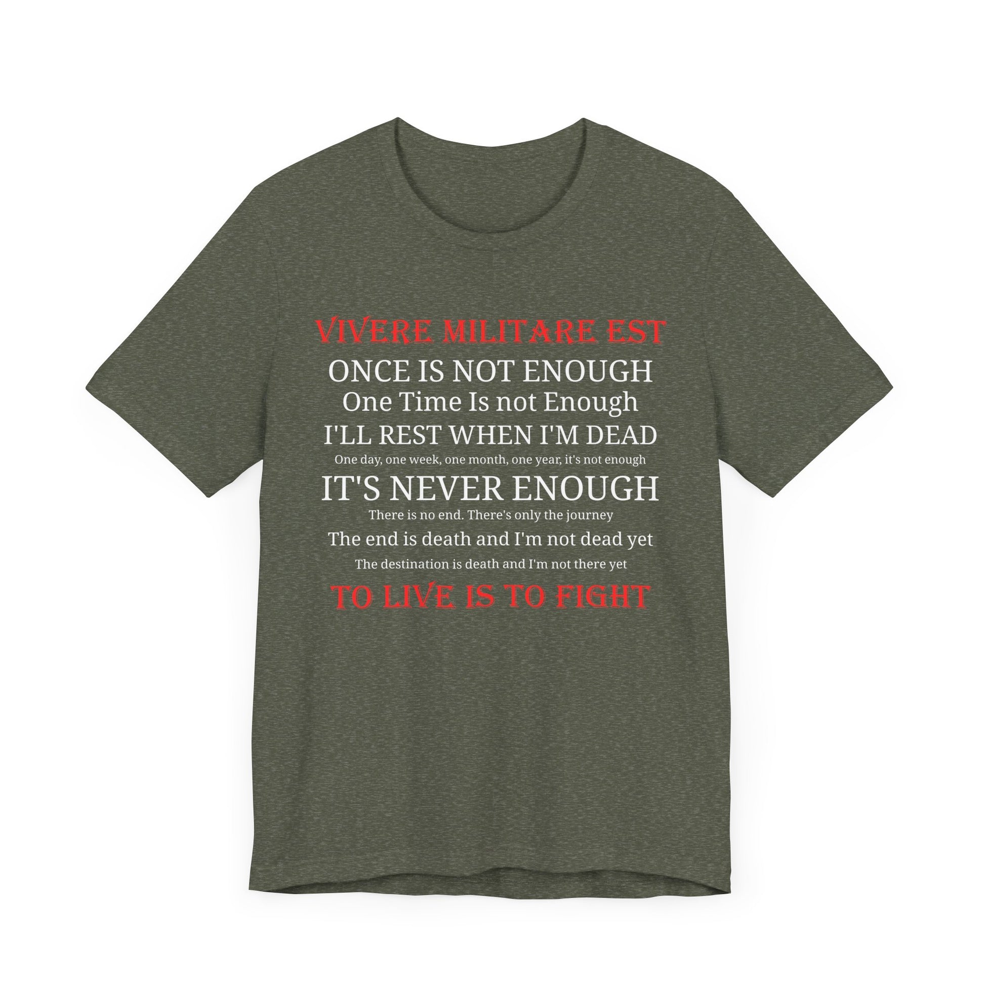 This T-shirt features the Latin phrase Vivere Militare Est and its English translation, with added inspirational phrases like 'Once is not enough' and 'I'll rest when I'm dead'. The design exudes a motivating and determined vibe, perfect for those who seek to embrace challenges and never give up. Ideal for individuals who are into self-improvement, fitness, and personal growth. Relevant for occasions such as fitness challenges, New Year's resolutions, and motivational events.
