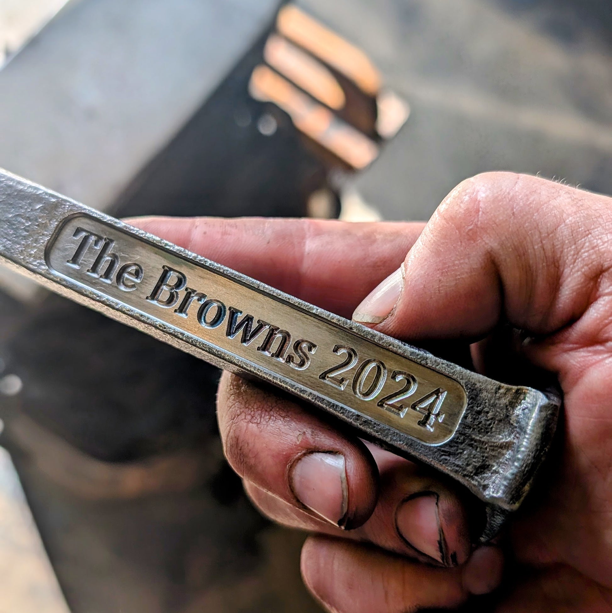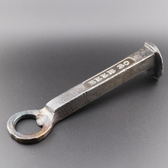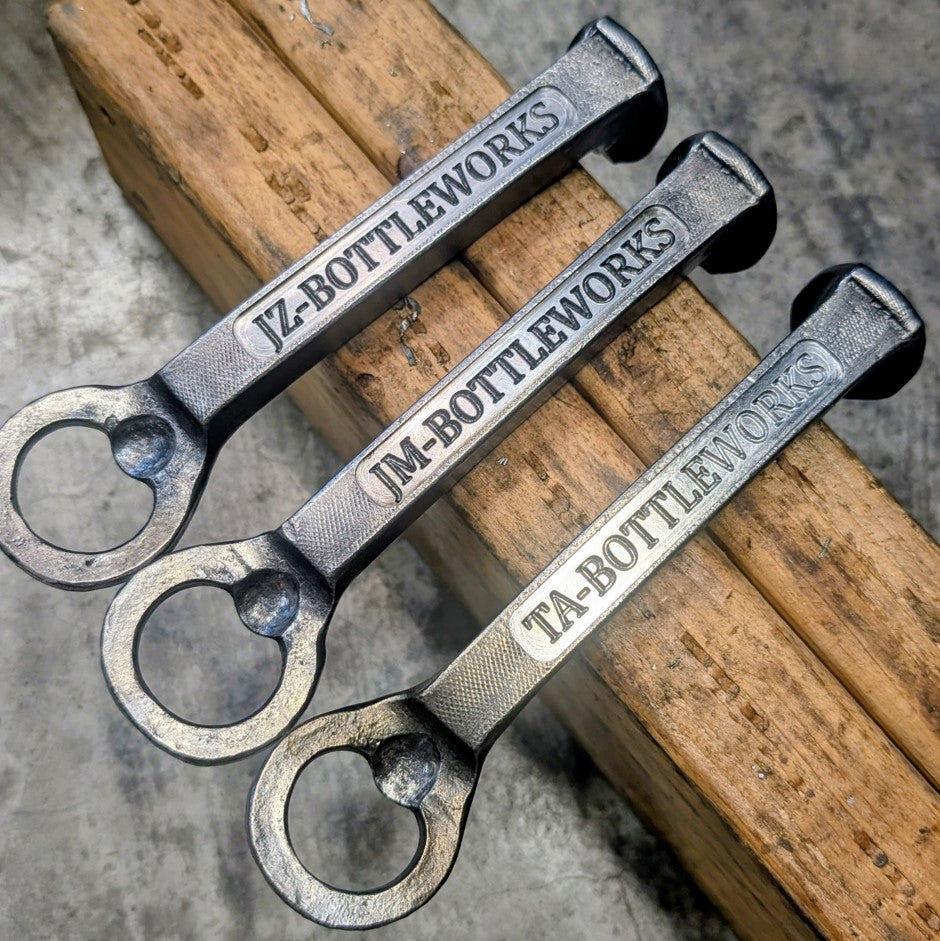 An eclectic twist on opening a bottle of beer. These hefty bottle openers are made using Railroad Spikes with custom-engraved text. Great for home use or as a custom opener in a professional establishment.